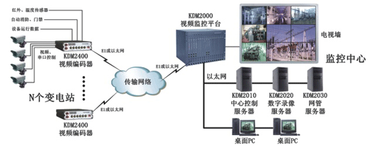 每個變電站根據(jù)需要設(shè)立視頻監(jiān)控點,可以部署1臺或者多臺KDM2400視頻編碼器,每臺KDM2400可以同時接入4臺攝像機。除了提供視頻編碼功能外,KDM2400還提供RS232/422/485串口,可支持透明串口功能,用于遠程控制攝像機云臺或采集設(shè)備運行數(shù)據(jù);提供4路電平輸入和3路電平輸出,實現(xiàn)紅外、溫感、煙感等告警信號的輸入和反向控制或聯(lián)動信號的輸出;提供1路E1接口和1路10/100M以太網(wǎng)接口,可根據(jù)具體傳輸線路的情況選擇不同的接入方式與監(jiān)控中心互聯(lián)。